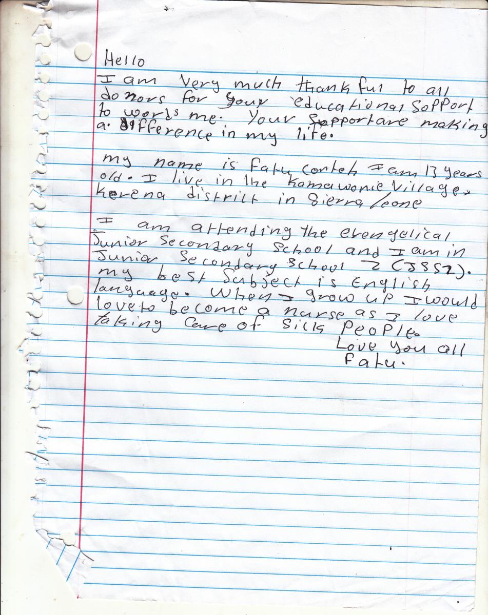 Fatu Writes a Letter of Thanks to You!