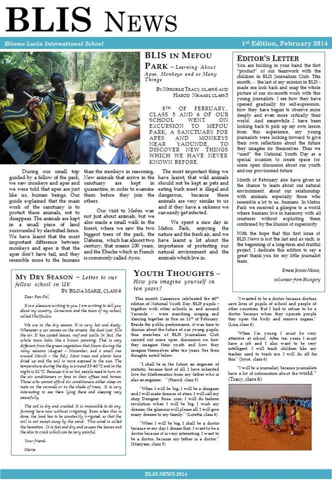 In February, the Journalism Club at out Partner school in Cameroon - Bitame Lucia, published its first "one-paper" print journal. Thanks for your support that is helping to prepare the kids for a great future.